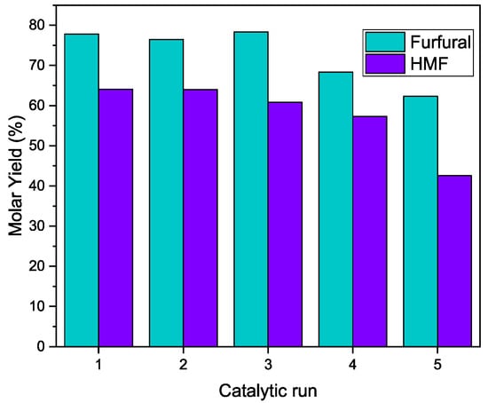 The catalyst robustly carried out the dehydration of the sugars without barely any loss of performance during the first three and four cycles when the target molecules were furfural and HMF, respectively, even if there was no treatment of regeneration between cycles. In both cases, after the fourth catalytic run, there was a noticeable diminishment in the yield of both furans. This decrease could have been caused by the large quantity of micropores in HMS-Nb, which are more easily blocked by the adsorption of products resulting from secondary reactions after several catalytic runs.