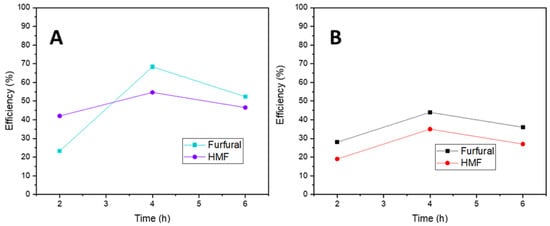 The yield of furfural and HMF obtained after the catalytic assays was expressed in terms of molar quantities as in Equations (1) and (2), respectively, for the case of the commercial mixture, and as efficiency in Equations (3) and (4) for the dehydration of the Ulva rigida hydrolysate, defining efficiency as the quotient of the quantity of target molecule in mol and the potential quantity of pentoses or hexoses in mol. The potential pentoses or hexoses were calculated by carrying out an acid hydrolysis on the Ulva rigida, as further described in the Supplementary Materials.