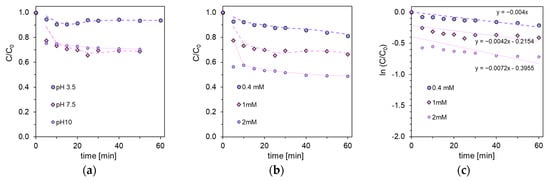 Better results were obtained when the classic chemical oxidation process was additionally supported by the presence of UV radiation. However, in this case, the rate of SA degradation depends on the pH of the system (Figure 1a). After 60 min, the substrate concentration decreased by 30% at pH 7.5 and 10. The reaction was significantly slower at pH 3.5, with a degradation of 12% observed. In an aqueous solution, sodium hypochlorite dissociates into two main chemical compounds: hypochlorous acid (HOCl) and hypochlorite ion (OCl−). The proportion of HOCl and OCl− forms present in water depends primarily on the pH. Under alkaline conditions (above pH 7), the OCl− ion dominates, while a pH below 7 shifts the equilibrium towards HOCl. When the pH of the sodium hypochlorite solution falls below pH 4.5, the equilibrium of the solution shifts towards the production of free Cl2.