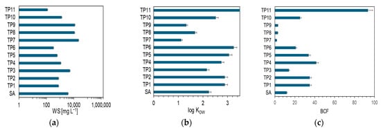 Boiling point (BP) and vapor pressure (VP) provide information on whether a compound will be emitted into the atmosphere relatively quickly after being released into the environment. Typically, an organic compound is considered volatile if it has 15 or fewer carbon atoms, its vapor pressure is greater than 10 Pa (0.75 mmHg) at 25 °C, and its boiling point at atmospheric pressure is less than 260 °C []. Table 3 shows that 2-chlorophenol (TP3), 2,6-dichlorophenol (TP4), and trichloroacetic acid (TP9) meet these criteria. The remaining chlorinated products have a VP below 7.5 × 10−2 mmHg and can therefore be classified as low-volatility compounds. The BP and VP parameters indicate that the organochlorine transformation products of SA do not tend to evaporate and remain in the liquid phase. The water solubility (WS) parameter suggests the fate of substances in water bodies. The solubility of SA in water at 25 °C is 3808 mg·L−1 (Figure 5a). Significantly higher solubility is exhibited by (2-chloro-4-hydroxyphenyl)(oxo)acetaldehyde (TP7); trichloroacetic acid (TP9); 4-chlorobenzene-1,2-diol (TP8); and 2-chlorophenol (TP3). 2,4-Dichlorophenol and 2,6-dichlorophenol have a high WS coefficient, but lower than SA. The ability of organochlorine substances to dissolve in water depends on the number of chlorine atoms present in the molecule structure and their position. An example of this is phenol, whose WS = 26,200 mg·L−1 [].