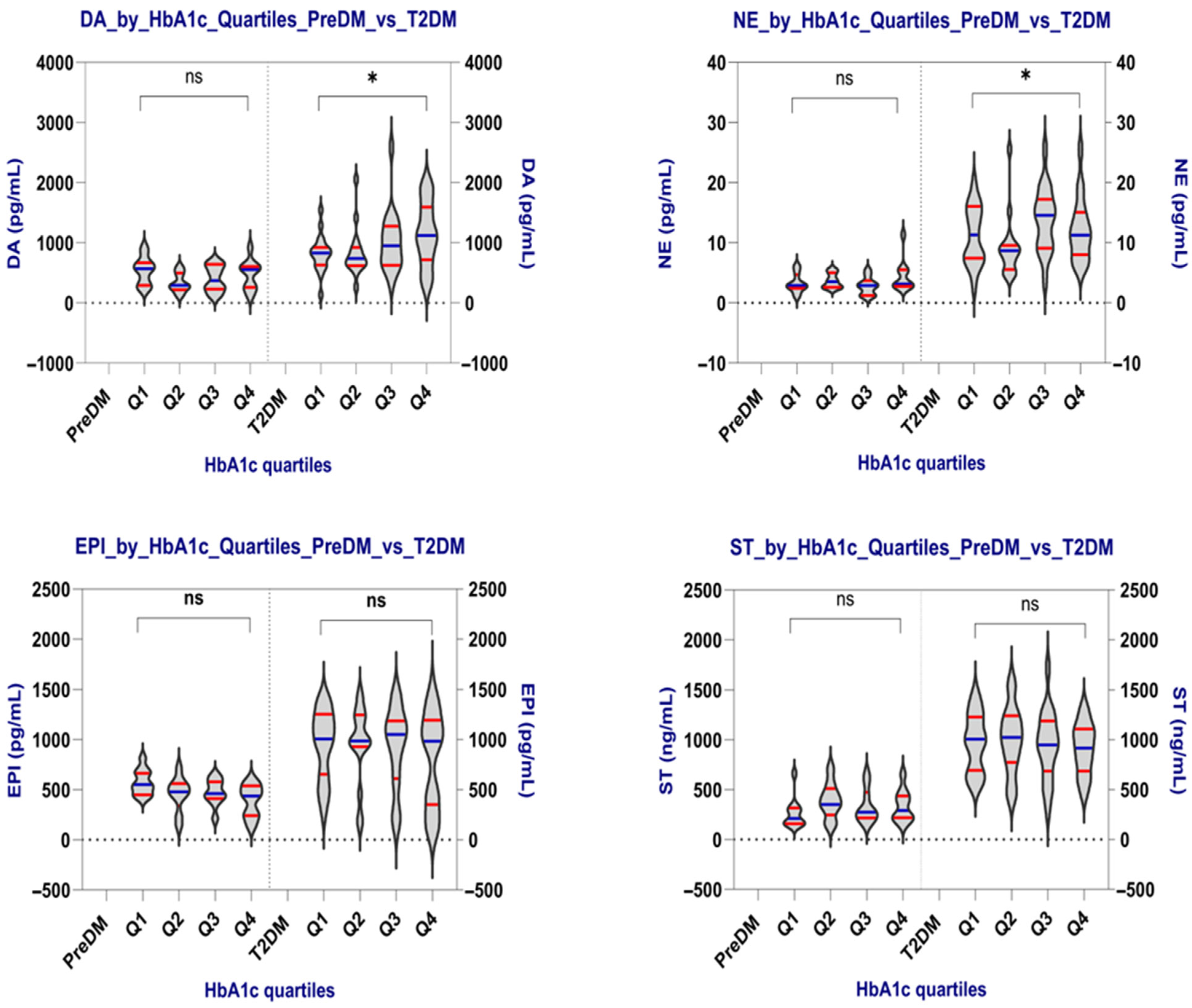 - Biomarker development: ST, NE, and DA may function as supplementary biomarkers for early disease detection, risk assessment, or tracking disease progression, especially when used alongside glycemic and lipid measurements.