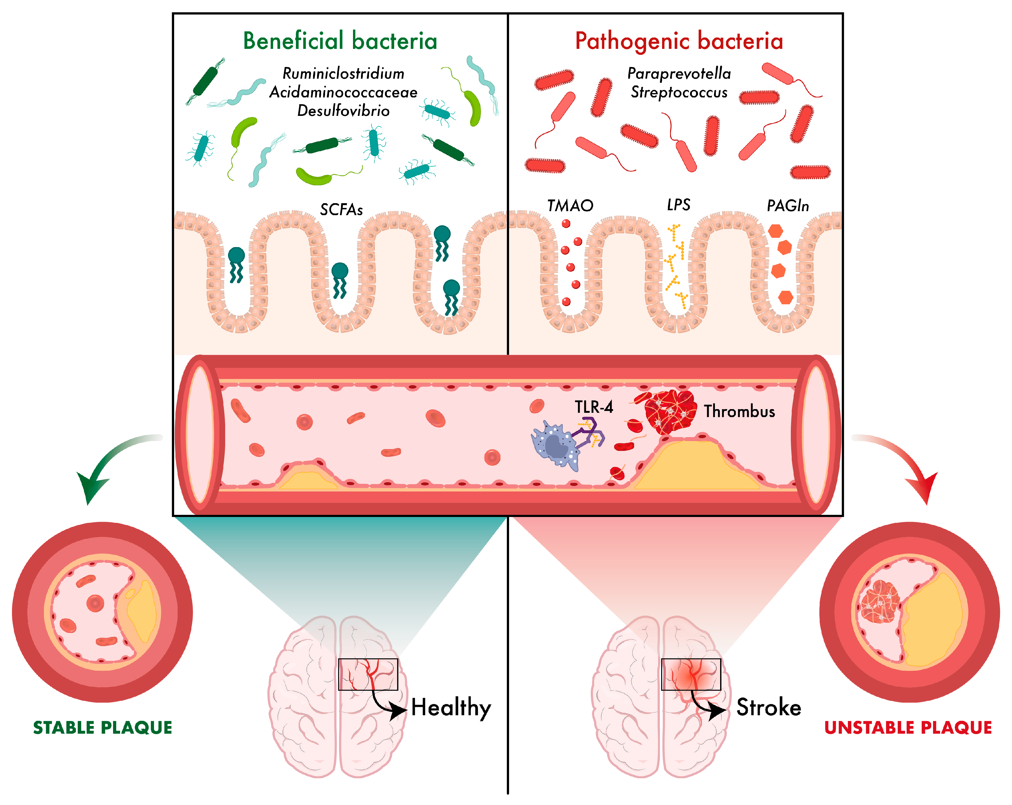 | Proteobacteria | Detrimental | Increased in severe stroke; induces systemic inflammation and neuroinflammation |
