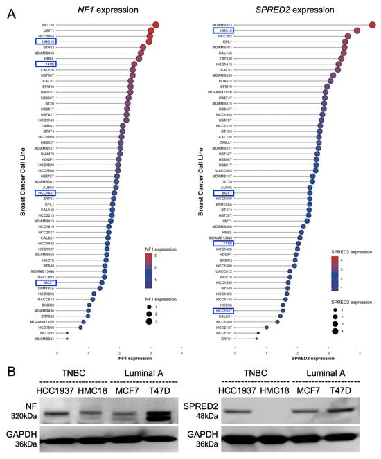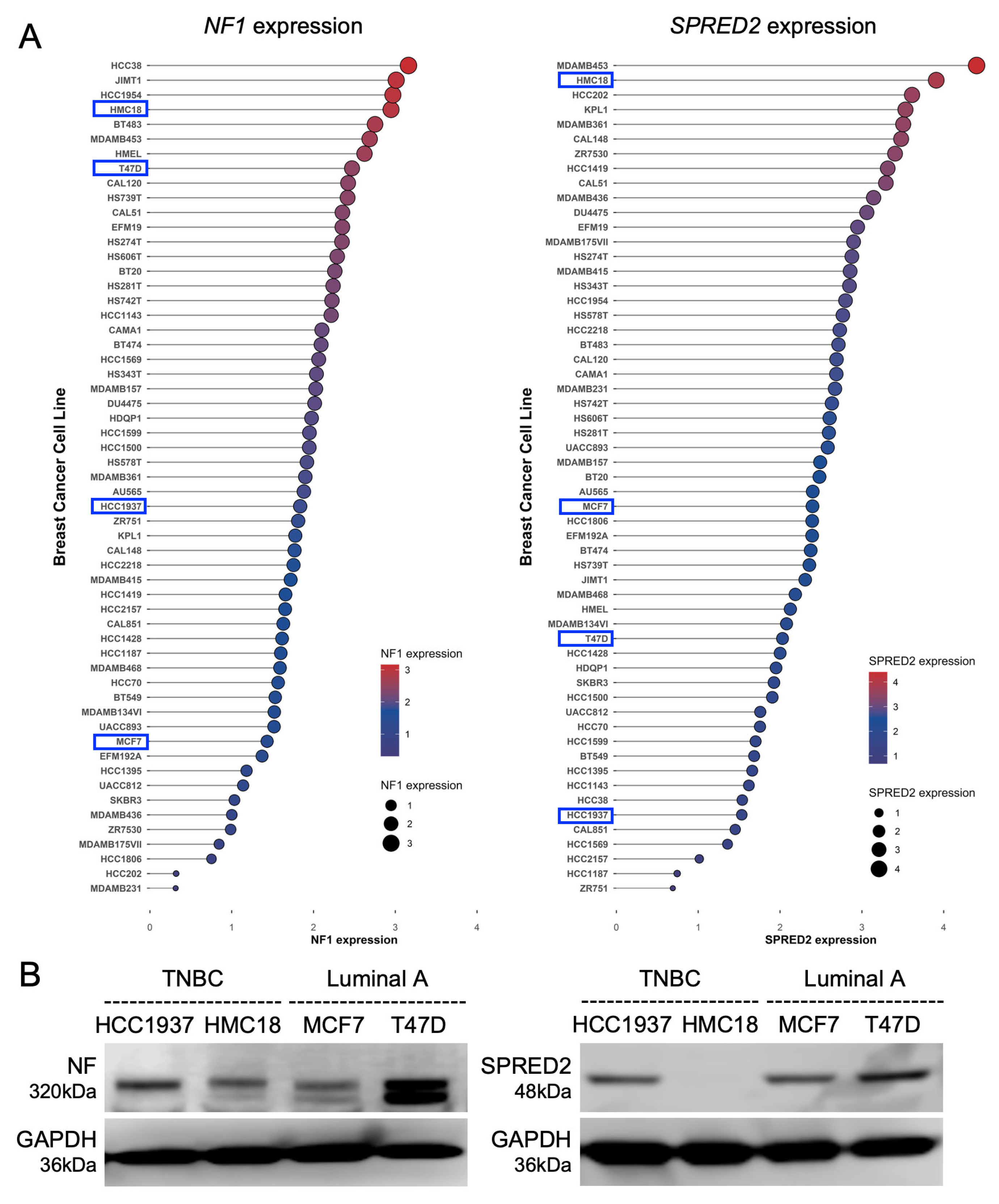 Expression of NF and SPRED2 in human breast cancer cell lines. (A) Normalized RNA-seq expression values of NF1 (left) and SPRED2 (right) were obtained from CCLE breast cancer cell lines. Raw read counts were processed in R (v3.36) using the edgeR package (version 3.36) with trimmed mean of M-values normalization and transformed to log2 counts per million. Cell lines are ranked in descending order of expression. Dot size and color indicate normalized expression levels. The cell lines selected for subsequent experiments are highlighted by blue boxes. (B) Cell lysates were prepared from the indicated cell lines, and NF and SPRED2 protein expression were assessed by Western blotting. Representative images from three independent experiments are shown.