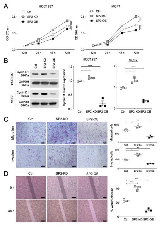 SPRED2 negatively regulates cancer cell proliferation, migration, and invasiveness. SPRED2 was knocked down (SP2-KD) or overexpressed (SP2-OE) in HCC1937 and MCF7 cells. (A) Cell proliferation was evaluated by MTT assay in each cell line. (B) Cell lysates were prepared from control (Ctrl), SP2-KD and SP2-OE cells, and cyclin D1 expression was analyzed by Western blotting. Representative images are shown on the left, and band intensities were quantified and semi-quantitated from three independent experiments on the right. Cyclin D1 expression levels were normalized to GAPDH. (C) Cell migration and invasion assays were performed using HCC1937 cells. Representative images are shown on the left (scale bars: 100 μm). For quantification, cells in three randomly selected low-power fields (20× magnification) per membrane were counted (three independent experiments). (D) Scratch assays were performed using MCF7 cells. Representative images captured with an inverted microscope are shown on the left (scale bars: 100 μm). The wound gap distance was measured at the indicated time points using Image J software (three independent experiments). * p < 0.05, ** p < 0.01, **** p < 0.0001 (two-tailed unpaired t-test).