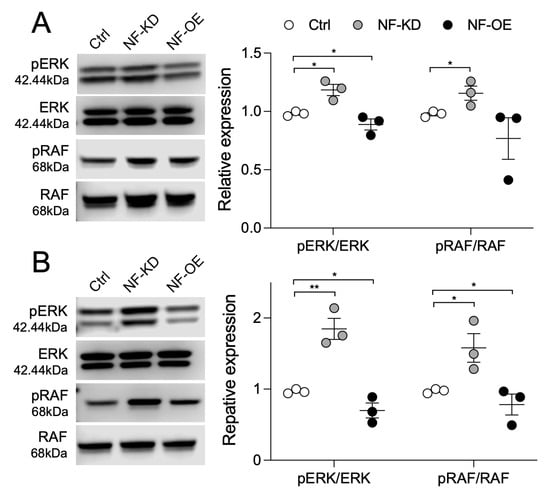 NF negatively regulates ERK and RAF activation. NF was knocked down (NF-KD) or overexpressed (NF-OE) in HCC1937 and MCF7 cells. ERK and RAF phosphorylation in HCC1937 cells (A) and MCF7 cells (B) were analyzed by Western blotting. Representative images are shown on the left, and band intensities were quantified and semi-quantitated from three independent experiments on the right. * p < 0.05, ** p < 0.01 (two-tailed unpaired t-test).