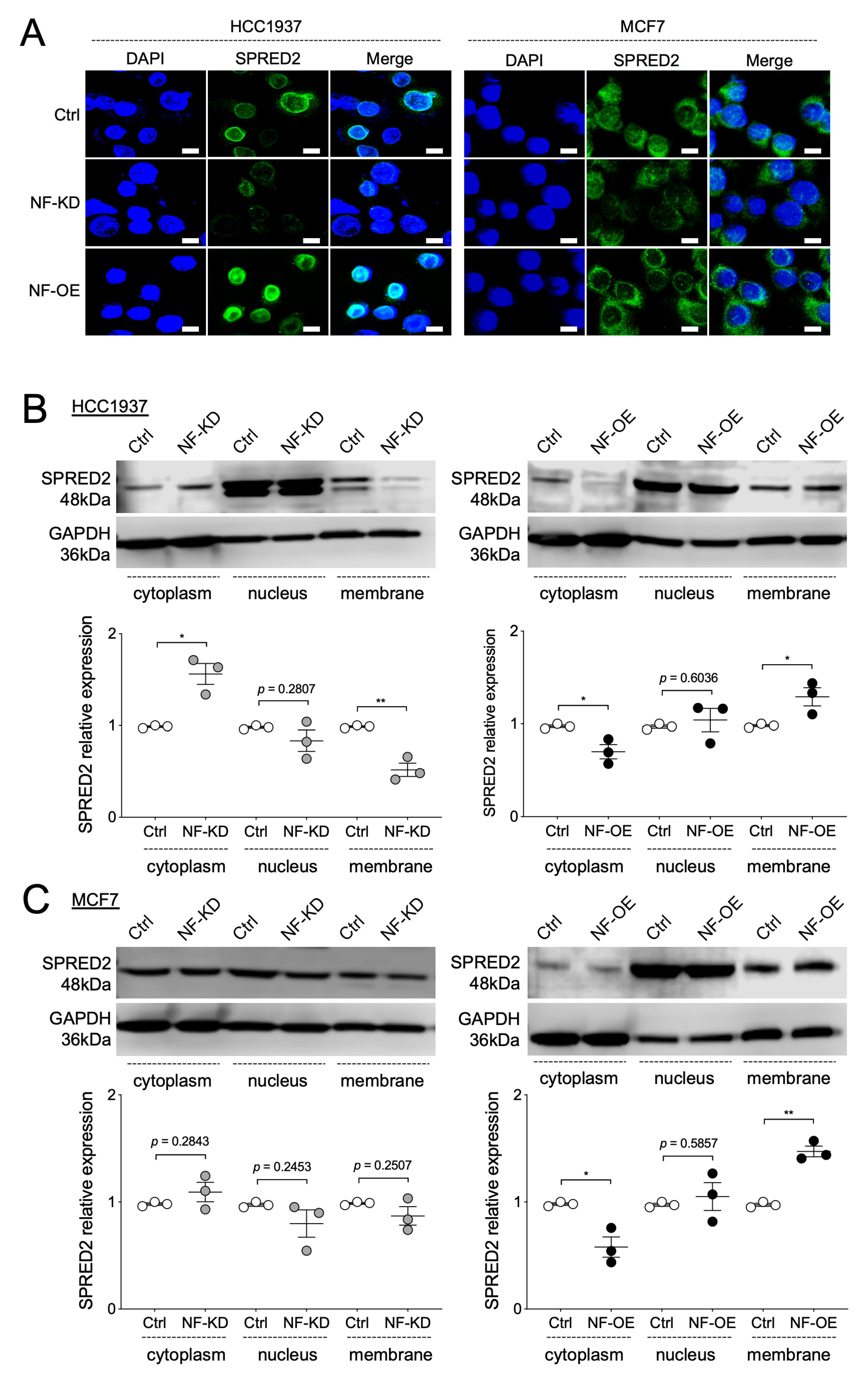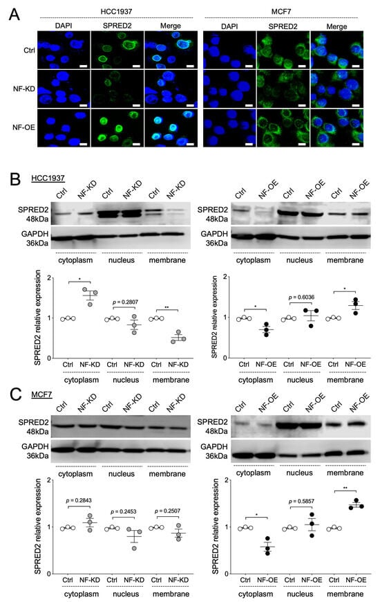 NF promotes the membrane translocation of SPRED2. (A–C) NF was knocked down (NF-KD) or overexpressed (NF-OE) in HCC1937 and MCF7 cells by transfection with control siRNA (Ctrl) or NF-specific siRNA, and with control plasmid (Ctrl) or NF-overexpression plasmid, respectively. (A) SPRED2 localization in HCC1937 (left) and MCF7 (right) cells were examined by immunofluorescence using a confocal microscope. Representative images are shown (scale bars: 10 μm). (B,C) Cytoplasmic, nuclear, and membrane protein fractions were isolated from the HCC1937 (B) and MCF7 (C) cells. The expression of each protein was analyzed by Western blotting. Representative images are shown in the upper panels, and band intensities were quantified and semi-quantitated from three independent experiments in the lower panels. * p < 0.05, ** p < 0.01 (two-tailed unpaired t-test).
