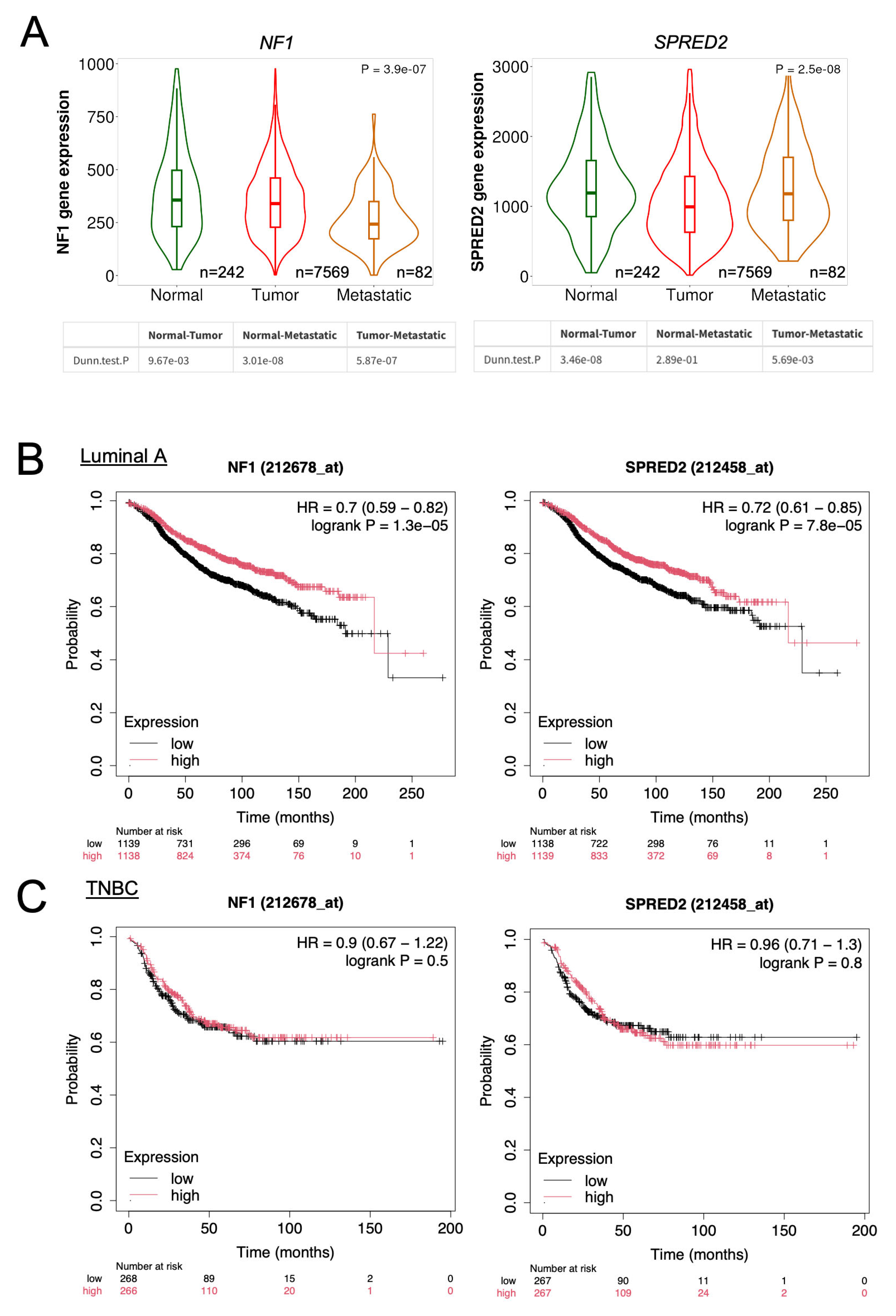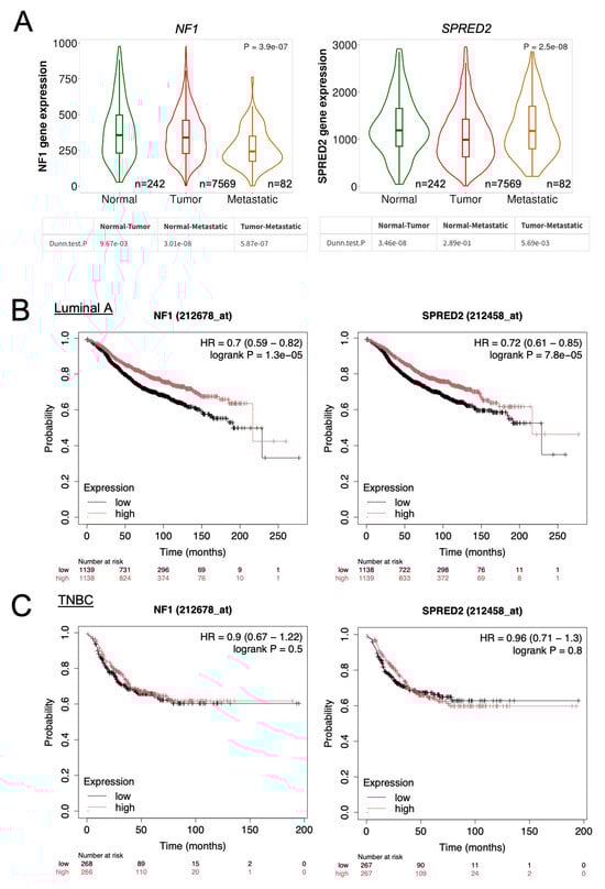 NF1 and SPRED2 mRNA expression in normal breast tissues, BC tissues, and metastatic tissues were obtained from TNMplot (https://tnmplot.com/analysis/ (accessed on 1 September 2025)). The prognostic significance of NF1 and SPRED2 mRNA expression in patients with invasive luminal A BC and TNBC were assessed using the data from the Kaplan–Meier Plotter (https://kmplot.com/analysis/ (accessed on 16 September 2025)).