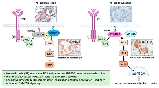 In conclusion, we demonstrated here that NF and SPRED2 inhibit BC malignant phenotype by suppressing the RAS/RAF/ERK pathway. NF promotes SPRED2 membrane localization, thereby enabling effective RAF/ERK inhibition. Notably, SPRED2 membrane expression was absent in NF-negative BC, present in a subset of luminal A cases (18/35), and absent in TNBC. Given the aggressive nature and limited treatment options of TNBC, loss of NF–SPRED2 interaction may contribute to its malignant phenotype. Although precision oncology has advanced, conventional chemotherapy remains the mainstay for TNBC, often with suboptimal outcomes []. Targeting the RAS/RAF/ERK pathway represents a promising therapeutic strategy [], and recent studies have investigated bioactive products derived from plants, microbial or marine organisms, as well as nanomaterials, as modulators of this pathway, including in BC [,]. Collectively, our findings emphasize the NF–SPRED2 axis as a potential novel therapeutic target, and strategies aimed at restoring or enhancing its function may offer novel approaches for the prevention and treatment of BC, particularly TNBC.