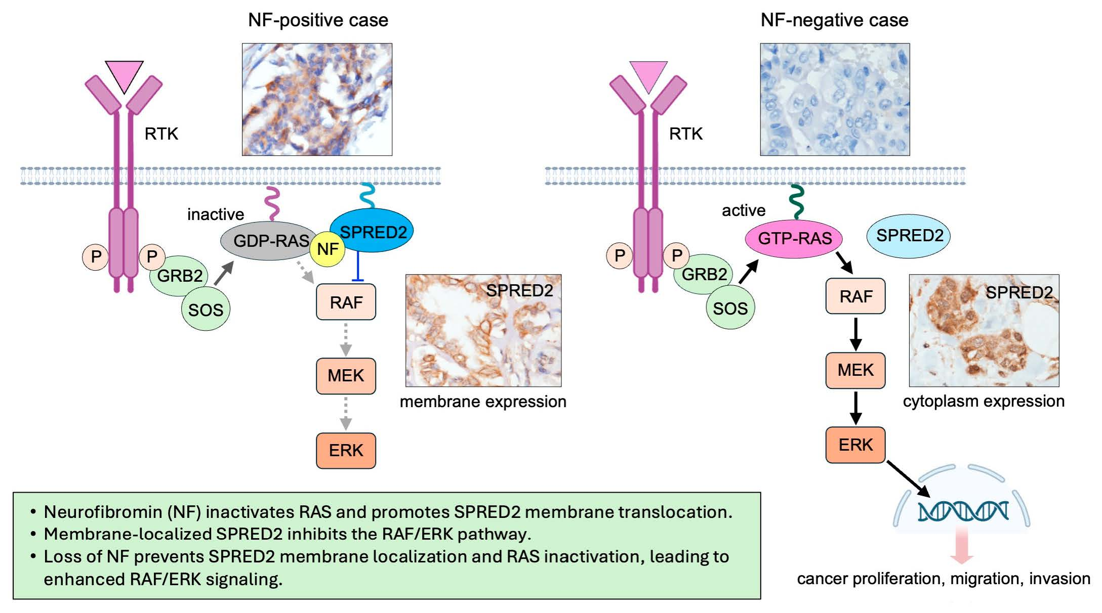 Recent studies have underscored the pivotal role of SPRED2 in cancer development and progression, generating considerable research interests. Similarly, NF functions as an endogenous inhibitor of RAS/RAF/ERK pathway and NF1 mutations are known to have a higher risk of cancerous tumors. In this study, we aimed to investigate the role of NF and its interaction with SPRED2 in BC. Previous studies have primarily examined the independent tumor-suppressive functions of NF1 or SPRED2 in various cancers; however, the cooperative interaction between these proteins and their biological significance in BC remain unclear. Our findings advance the field by demonstrating that NF is required for SPRED2 membrane localization, which is essential for effective inhibition of the RAS/RAF/ERK pathway–a mechanistic link not previously described in BC. Notably, SPRED2 membrane localization was absent in NF-negative tumors and in TNBC cases, but retained in a subset of luminal A BC, suggesting a novel mechanism that may contribute to the aggressive phenotype of TNBC. Collectively, these results represent a conceptual advancement over previous studies focused solely on single-protein functions, emphasizing the critical role of NF–SPRED2 interaction in BC pathology.