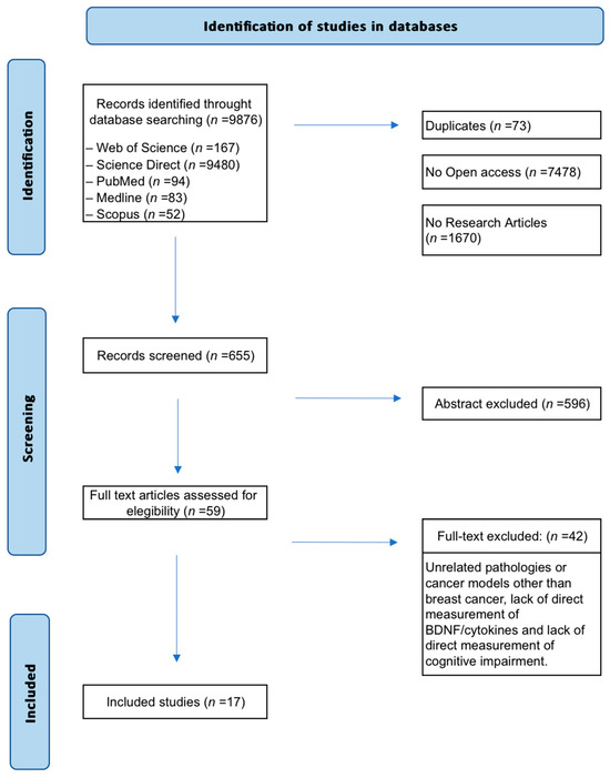 A total of 9876 records were initially retrieved (Figure 1). Non-original studies (e.g., reviews, editorials), articles without full-text access, and duplicates were excluded. Then, 655 articles were screened by title and abstract. Of these, 59 met preliminary criteria and underwent full-text review. Forty-two studies were excluded because they were published before 2000, addressed pathologies other than breast cancer, lacked direct measurements of biomarkers such as cytokines or BDNF, or failed to assess cognitive decline. Finally, 17 preclinical studies were included in the synthesis.