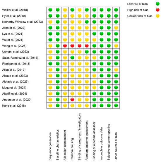 The results revealed that the domains with the lowest risk of bias were “Baseline characteristics” (all studies received a low rating; e.g., Walker et al. (2018) [53] reported comparable age and sex across groups) and “Selective outcome reporting” (low in 100% of cases, such as in Allen et al. (2019) [63], where all predefined outcomes were reported). Conversely, the domains with the highest risk were “Allocation concealment” (unclear in 16/17 studies; e.g., Alsaud et al. (2023) [64] did not describe concealment methods) and “Blinding of caregivers/investigators” (unclear in 15/17 studies; e.g., John et al. (2022) [56] omitted blinding details). Discrepancies were observed in “Random housing”, with some studies rated as low—for example, Salas-Ramirez et al. (2015) [61] described standardized conditions—and others as high [68], the latter housing animals by treatment group, potentially introducing bias. A recurring pattern was the lack of detailed reporting on randomization and blinding procedures, whereas data completeness and outcome reporting were consistently robust. For instance, Lyu et al. (2021) [57] justified a low risk in “Blinding of outcome assessors” by using automated analysis, while Wang et al. (2025) [59] was rated as having high risk in multiple domains due to methodological omissions. These findings underscore the need for improved documentation of critical procedures to minimize bias in preclinical studies.