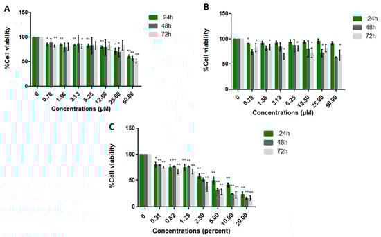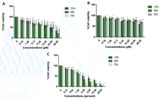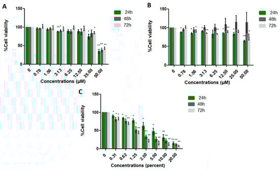 | Time/Treatment | 24 h | 48 h | 72 h | 24 h | 48 h | 72 h | 24 h | 48 h | 72 h |