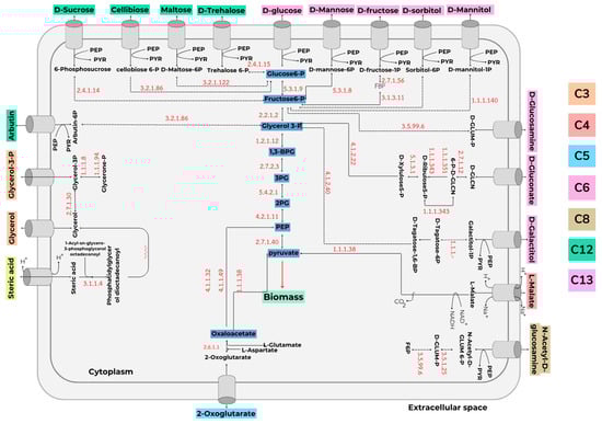 3.4.2. Flux Balance Analysis (FBA) and Identification of Key Reactions for Biomass Production in the Genome-Scale Metabolic Model