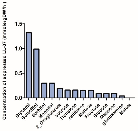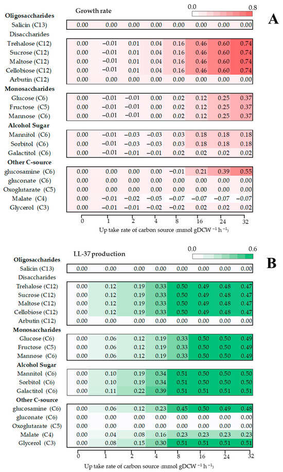 - = Flux rate of the LL-37 peptide biosynthesis reaction (mmol/gDWh−1)