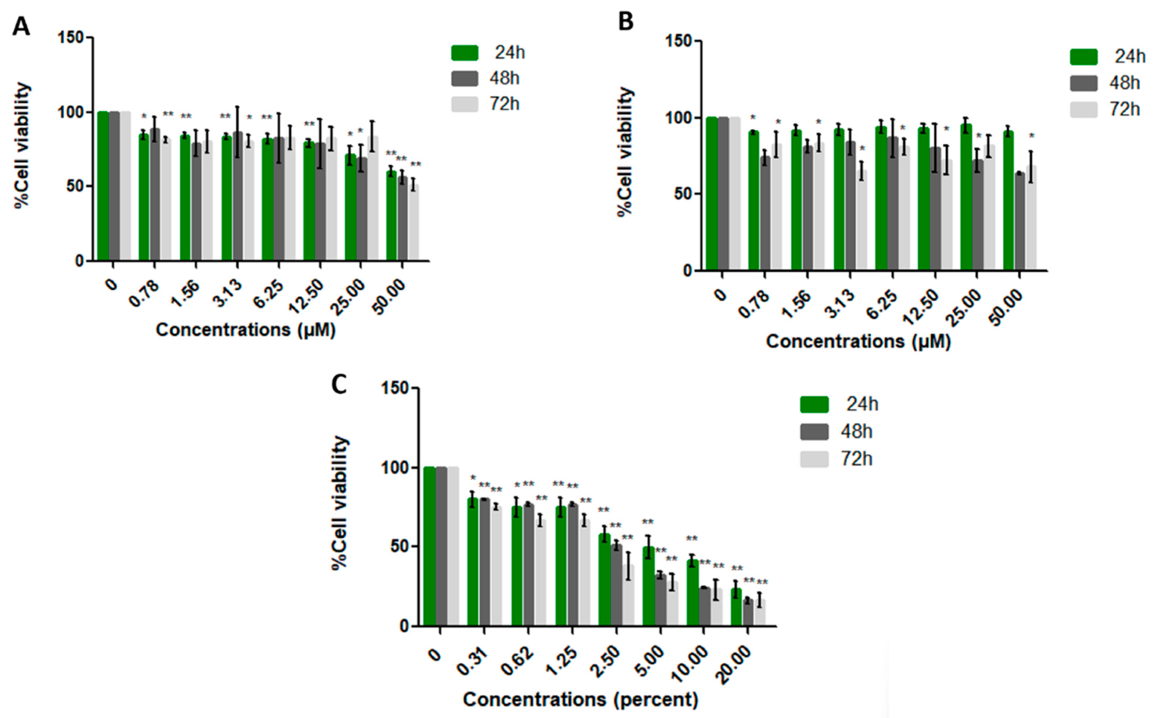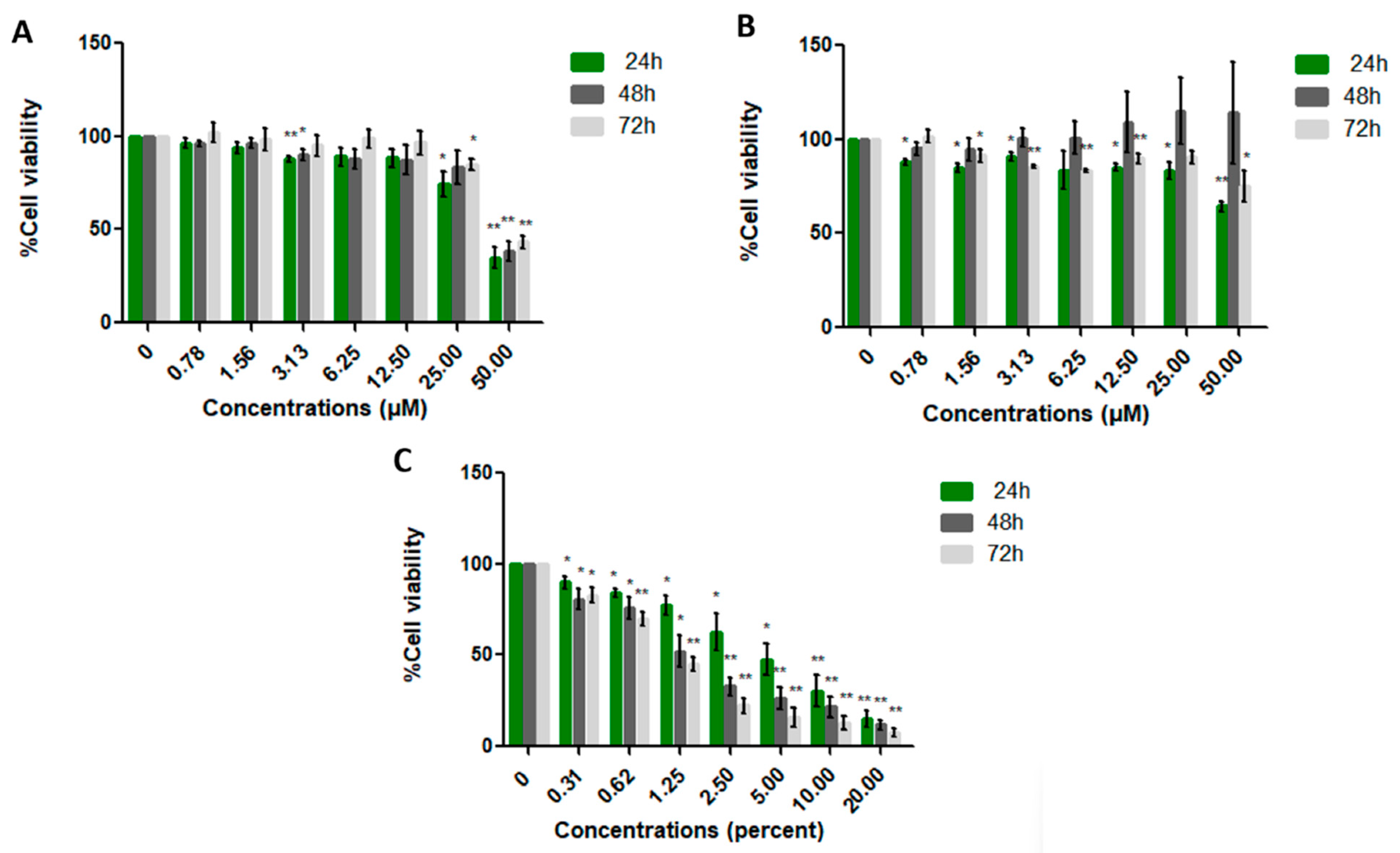 | Time/Treatment | 24 h | 48 h | 72 h | 24 h | 48 h | 72 h | 24 h | 48 h | 72 h |