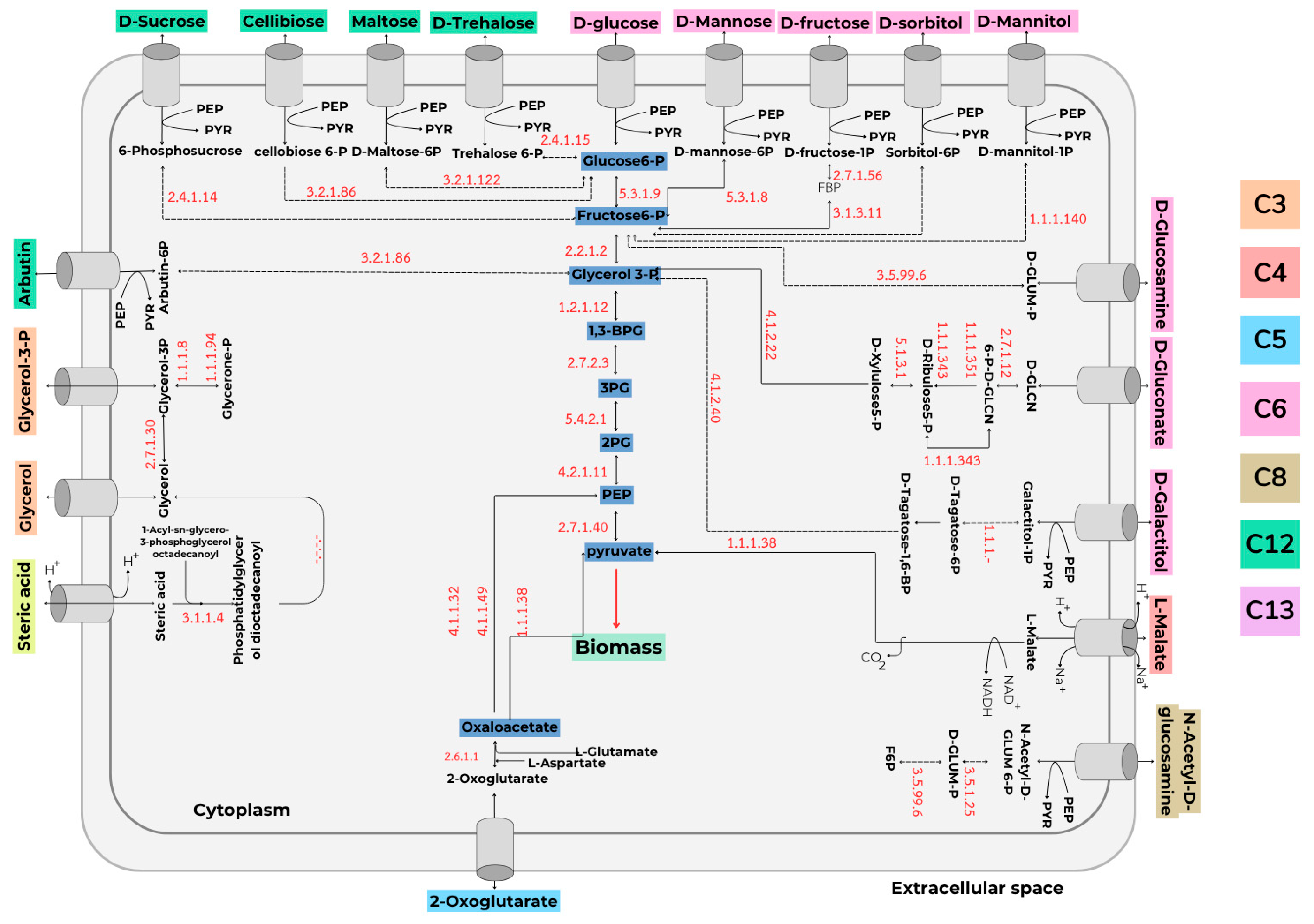 3.4.2. Flux Balance Analysis (FBA) and Identification of Key Reactions for Biomass Production in the Genome-Scale Metabolic Model