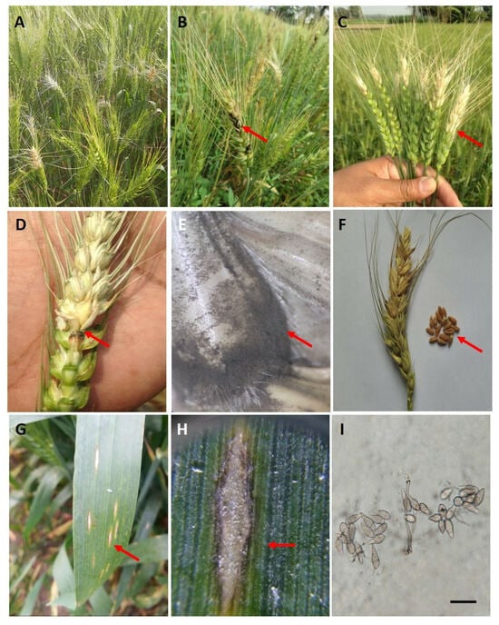 Typical wheat blast disease symptoms and signs caused by Magnaporthe oryzae pathotype Triticum (MoT). (A) A wheat field showing characteristic signs of blast infection with partially bleached spikes; (B) Infected wheat plants showing wheat blast symptoms on wheat heads, with dark-colored infection points. (C) Wheat spikes exhibiting partial bleaching and disruption of spikelet development; (D) Severe infection of the wheat rachis by MoT, leading to necrosis, blockage of nutrient flow, and spikelet death. (E) Infected glume with dark-gray sporulation of the fungus MoT. (F) Severely shriveled or wrinkled wheat grains from the blast-affected spike. (G) Typical elongated or elliptical lesions on wheat leaves. (H) A typical elliptical lesion with white to tan centers and a reddish-brown margin on a mature leaf. (I) Two-septate hyaline to pale gray-colored pyriform conidia of MoT under a compound microscope (magnification 400×). Red arrows indicate characteristic disease symptoms or fungal structures associated with wheat blast. (G–I) were taken from [5]. Scale bar = 20 μm.