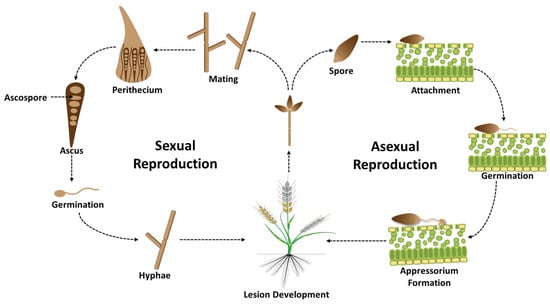 M. oryzae (syn. Pyricularia oryzae), formerly known as M. grisea, is a species complex infecting more than 50 grasses, including wheat, rice, barley, oats, ryegrass, millet, and crabgrass [15,16]. Within this complex, distinct host-specific lineages exist, with the wheat-infecting population recently separated as M. oryzae pathotype Triticum (MoT) [6]. The fungus reproduces both asexually and sexually (Figure 2). Asexual reproduction occurs via pyriform, three-celled conidia that are hyaline to pale gray and serve as the primary source of inoculum; these conidia germinate on hydrophobic surfaces and form melanized appressoria that generate high turgor pressure to penetrate host tissues [12]. Sexual reproduction, although less frequent in nature, produces perithecia containing four-celled ascospores, while some strains also form a Phialophora-like anamorph that produces microconidia of uncertain ecological role [17,18]. Both conidia and ascospores can initiate infection under favorable conditions, and penetration failures on non-adapted hosts often elicit hypersensitive-like responses [19]. MoT is a hemibiotrophic fungus that initiates infection with a biotrophic phase, colonizing living host cells before transitioning to a necrotrophic stage that kills tissue to extract nutrients [12]. Optimal development and spread of MoT occur under warm (25–30 °C), humid conditions with extended leaf wetness, which favor conidial germination, sporulation, and epidemic outbreaks, particularly during flowering [5]. Wind and rain-splash contribute to local and long-distance dispersal, underscoring the pathogen’s capacity for rapid epidemic expansion [6,20]. Between cropping seasons, MoT survives in crop residues, alternative hosts such as Digitaria spp., and contaminated seeds, which facilitate both local survival and long-distance dispersal [21,22,23].