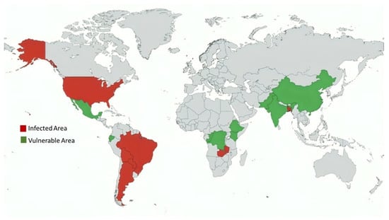Global distribution and risk zones of wheat blast disease. Countries with confirmed outbreaks are shown in red, while those considered highly vulnerable due to favorable climatic and agricultural conditions are shown in green. The causal pathogen Magnaporthe oryzae pathotype Triticum (MoT) was first reported in Brazil and is now endemic in several South American countries. A major intercontinental outbreak in Bangladesh highlighted the serious threat to South Asian wheat production. More recently, the detection of wheat blast in Zambia has raised concerns over the potential spread to other wheat-producing regions in Africa, including Ethiopia, Kenya, and the Democratic Republic of the Congo. The figure is constructed using data from [4,5,26,27,28,29,30,31].