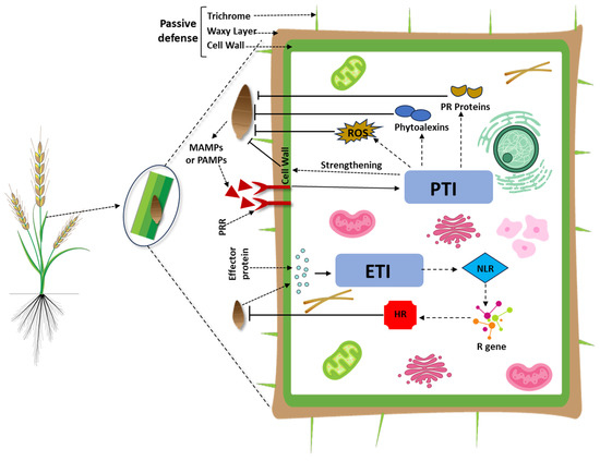 Although triggered by distinct PAMPs, PTI and ETI activate many of the same signaling cascades, such as the oxidative burst and the accumulation of PR proteins, which differ only in duration and intensity [47]. While HR has been regarded as a defining characteristic of ETI, it has also been shown that HR can be elicited by PAMP-triggered PTI [52,53]. Therefore, ETI has been considered a stronger form of PTI [54,55]. Moreover, both types of immune responses alter ion flux, redox status, and activate mitogen-activated protein kinase (MAPK) pathways, ultimately inducing gene expression for plant defense [47]. Increasing evidence also suggests that PTI- and ETI-mediated resistance is implicated not only in resistance specific to certain cultivars but also in resistance in non-hosts [56,57]. Therefore, PTI and ETI hold promise for crop improvement. However, the role and nature of their interaction regarding wheat blast remain unknown.