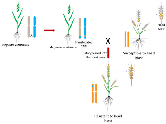 On the contrary, a comprehensive study evaluating over 780 cultivated wheat and wild relative accessions in the field and greenhouse detected only 4 non-2NS spring wheat accessions from CIMMYT with demonstrable resistance to blast [82]. Nevertheless, the level of resistance observed was inadequate against some isolates, indicating the limited and unreliable nature of non-2NS resistance. This finding reinforces the status of the 2NS translocation as the most dominant and dependable major resistance locus. In contrast, loci located in other chromosomal regions have minimal phenotypic impact and are not consistently expressed [76]. Therefore, to enhance blast resistance against the contemporary MoT population, the 2NS chromosomal segment can be deployed in an elite wheat background through molecular breeding. This involves introgressing the 2NS chromosomal segment from A. ventrocosa into elite wheat backgrounds through repeated backcrossing coupled with MAS, which can accelerate the development of resistant cultivars against the current MoT (Figure 5).