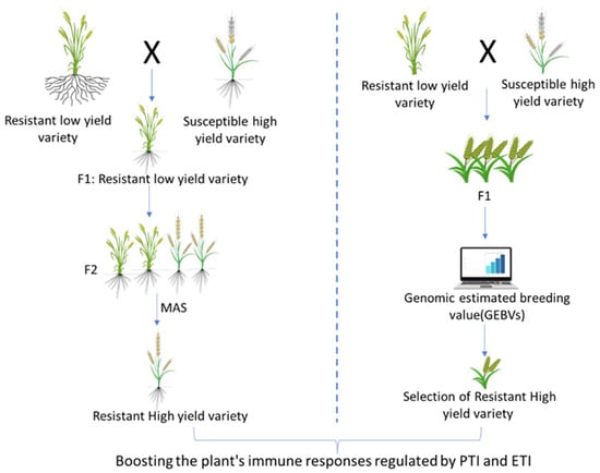Comparative schematic representation of marker-assisted selection (MAS) and genomic selection (GS) in molecular breeding for wheat blast resistance. Both approaches accelerate the development of resistant cultivars by facilitating the precise incorporation of resistance genes and quantitative trait loci (QTLs). MAS targets specific markers linked to known resistance genes, whereas GS predicts genomic estimated breeding values using genome-wide marker data. Together, these tools enable rapid enhancement of wheat’s innate immune responses, integrating pattern-triggered immunity (PTI) and effector-triggered immunity (ETI) to confer durable blast resistance.
