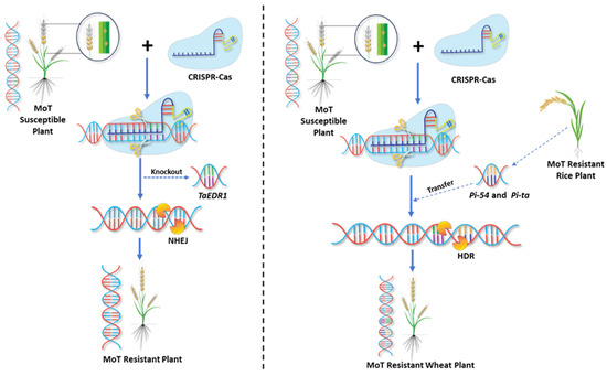 CRISPR-based genome editing, using both gene knock-out and knock-in strategies, offers multiple approaches to improve wheat blast resistance (Figure 7). This includes both targeting susceptibility genes for disruption and the precise introduction of resistance alleles. The application of CRISPR/Cas9 can enable targeted edits in blast resistance (R) and susceptibility (S) genes, thereby enhancing the plant’s ability to recognize and combat MoT infections. Notably, targeted knockout of the wheat susceptibility gene TaEDR1, a negative regulator of immunity, has resulted in improved resistance to wheat blast without affecting yield [104]. Similarly, modifications in ERF transcription factors have strengthened wheat’s innate immune responses, demonstrating the potential of gene editing to enhance resistance [112]. Although specific S genes conferring susceptibility to MoT in wheat are still under investigation, analogous efforts in other pathosystems, for instance, the disruption of TaHRC to enhance resistance against Fusarium head blight, highlight the promise of targeting such genes in wheat blast [111]. Transcriptomic and comparative genomic analyses of wheat-MoT interactions are accelerating the identification of key targets for genome editing interventions [113]. CRISPR/Cas9 can also enable molecular stacking and functional enhancement of R genes. Transfer and optimization of blast-resistant genes from rice, such as Pi-54 [114] and Pi-ta [115], by editing their wheat orthologs and synthetic gene design can confer broad-spectrum resistance to MoT. Engineering gene promoters to fine-tune gene expression for achieving optimal resistance against MoT through CRISPR/Cas9 also holds promise [93].