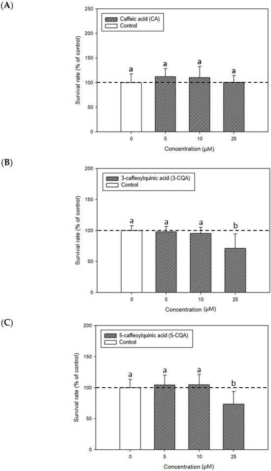 Effects of CA (A), 3-CQA (B), and 5-CQA (C) on the mouse P815 mast cell growth. Values are means ± SD (n = 6 biological determinations). Bars in the same plot not sharing a common letter (a, b) are significantly different (p < 0.05) from each other, analyzed by one-way ANOVA, followed by Duncan’s multiple range test. The original cell density was 1 × 105 cells/mL.