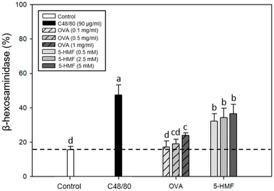 Effects of C48/80, OVA, and 5-HMF treatments on the β-hexosaminidase release of mouse P815 mast cells. Values are means ± SD (n = 6 biological determinations). Bars not sharing a common letter are significantly different (p < 0.05) from each other, analyzed by one-way ANOVA, followed by Duncan’s multiple range test. The original cell density was 1 × 105 cells/mL. C48/80, compound 48/80; OVA, ovalbumin; 5-HMF, 5-hydroxymethyl-2-furaldehyde.