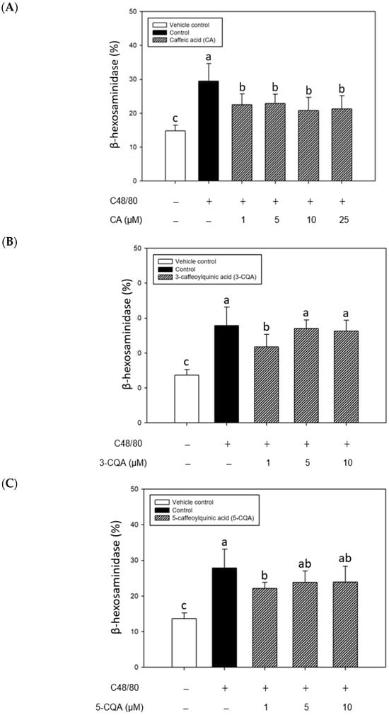 Inhibitory effects of CA (A), 3-CQA (B), and 5-CQA (C) treatments on the β-hexosaminidase release of C48/80-stimulated mouse P815 mast cells. Values are means ± SD (n = 6 biological determinations). Bars in the same plot not sharing a common letter (a, b, c) are significantly different (p < 0.05) from each other, analyzed by one-way ANOVA, followed by Duncan’s multiple range test. P815 mast cells were sensitized with C48/80 (90 μg/mL). The original cell density was 1 × 105 cells/mL. VC, vehicle control; Control, cell line sensitized with C48/80 without samples; C48/80, compound 48/80. “+”, addition; “−”, without addition.