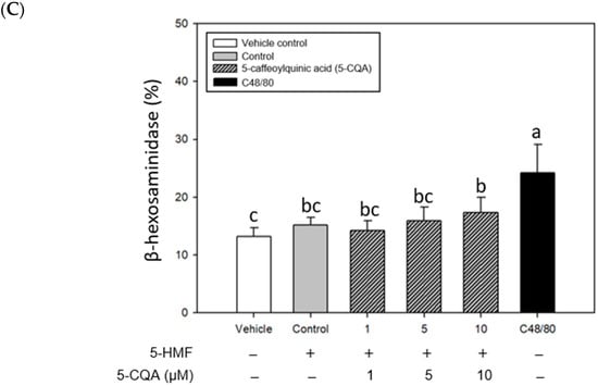 Figure 4 shows the effects of CA, 3-CQA, and 5-CQA treatments on the release of β-hexosaminidase in the mast cells stimulated with 5-HMF. The results showed that the release of β-hexosaminidase in the control group tended to increase compared with the vehicle control, but there was no statistically significant difference. A C48/80 treatment alone was selected for comparison in the experiment. The stimulatory effect on the mast cell degranulation was significantly higher (p < 0.05) than that of 5-HMF. Unfortunately, adding CA, 3-CQA, and 5-CQA could not considerably affect (p > 0.05) the percentage of β-hexosaminidase release in this 5-HMF-sensitized experiment model.