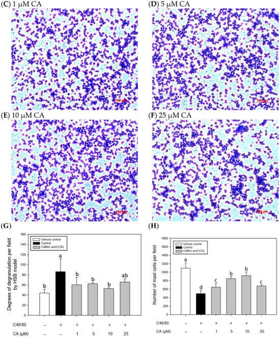 Effects of CA treatments on the appearance and morphology (A–F), quantification (G), and degranulation degrees (H) of C48/80-stimulated mouse P815 mast cells, stained with Toluidine Blue. Vehicle control (A); Control, cell line stimulated with C48/80 without samples (B); Pre-treatment with CA (1, 5, 10, and 25 μM) (C–F) on C48/80-stimulated P815 mast cells; Quantification of mast cell density (G) and degranulation degrees (H). Cells with adjacent red arrows indicate regular, and black arrows indicate degranulation. Scale bar = 100 μm. Values are means ± SD (3 random fields). Bars in the same plot not sharing a common letter (a, b, c, d) are significantly different (p < 0.05) from each other, analyzed by one-way ANOVA, followed by Duncan’s multiple range test. The cell number of mast cells and degranulation degrees were evaluated using ImageJ’s HSB model (version 1.53). P815 mast cells were stimulated with C48/80 (90 μg/mL). The original cell density was 1 × 105 cells/mL. C48/80, compound 48/80. “+”, addition; “−”, without addition.