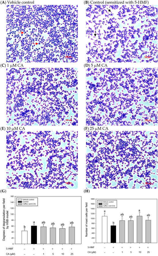 Effects of CA treatments on the appearance and morphology (A–F), quantification (G), and degranulation degrees (H) of 5-HMF-stimulated mouse P815 mast cells, stained with Toluidine Blue. Vehicle control (A); Control, cells stimulated with 5-HMF without samples (B); Pre-treatment with CA (1, 5, 10, and 25 μM) (C–F) on 5-HMF-stimulated P815 mast cells; Quantification of mast cell density (G) and degranulation degrees (H). Cells with adjacent red arrows indicate normal, and black arrows indicate degranulation. Scale bar = 100 μm. Values are means ± SD (3 random fields). Bars in the same plot not sharing a common letter (a, b) are significantly different (p < 0.05) from each other, analyzed by one-way ANOVA, followed by Duncan’s multiple range test. The cell number of mast cells and degranulation degrees were evaluated using ImageJ’s HSB model (version 1.53). P815 mast cells were sensitized with 5-HMF (5 mM). The original cell density was 1 × 105 cells/mL. 5-HMF, 5-hydroxymethyl-2-furaldehyde. “+”, addition; “−”, without addition.