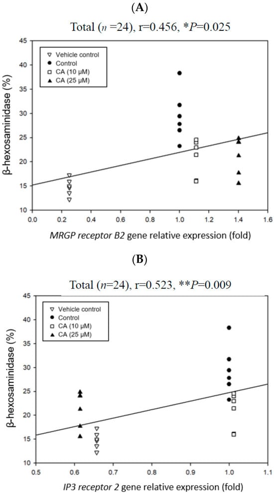 Correlations between relative expression folds of MRGP receptor B2 (A) and IP3 receptor 2 (B) genes involving degranulation-related signaling pathways and the β-hexosaminidase release in mouse P815 mast cells. The correlation was expressed by the Pearson product–moment correlation coefficient (r). * p < 0.05; ** p < 0.01.