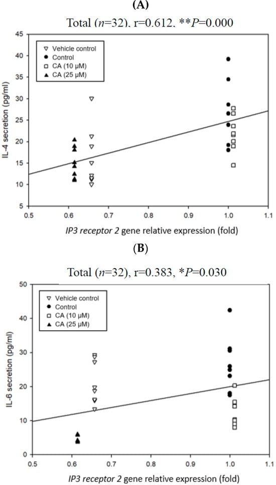 Pearson product–moment correlation coefficient (r) was adopted to analyze associations among degranulation degrees, relative expression folds of degranulation-related signaling pathway genes, and cytokine secretions by mast cells (Figure 3 and Figure 4). When the r value is positive, it represents a positive correlation. Otherwise, it represents a negative correlation. If the absolute r value is more significant than 0.7, it means a high correlation. When the absolute r value is between 0.3 and 0.7, it means a moderate correlation. If the absolute r value is below 0.3, it means a low correlation. Figure 7A shows the correlation between the relative expression folds of MRGP receptor B2 and β-hexosaminidase release in P815 mast cells. The results showed a significantly (p < 0.05) positive correlation between the MRGP receptor B2 mRNA expression amount and the β-hexosaminidase release rate (r = 0.456, * p = 0.025). More obviously, there was a significant (p < 0.05) positive correlation between the IP3 receptor 2 mRNA expression amount and the β-hexosaminidase release rate (r = 0.523, ** p = 0.009) (Figure 7B). Compared with the MRGP receptor B2 mRNA expression amount, a higher positive correlation between the IP3 receptor 2 mRNA expression amount and the β-hexosaminidase release rate was found (Figure 7). Importantly, CA treatment had a significantly inhibitory effect on the relative expression folds of the IP3 receptor 2 gene (Table 2). Therefore, IP3 receptor 2 gene relative expression folds were further selected to analyze the correlation with the cytokines (IL-4 and IL-6) levels secreted by the mast cells (Figure 8). Figure 8 shows correlations between the relative expression folds of the IP3 receptor 2 gene and the cytokines (IL-4 and IL-6) secreted by the mast cells. The results showed that the relative expression folds of the IP3 receptor 2 gene are significantly (p < 0.05) correlated with IL-4 (r = 0.612, ** p = 0.000) and IL-6 (r = 0.383, * p = 0.03) cytokine secretions (Figure 8). Based on the results, it is speculated that CA treatment may reduce the relative expression folds of the IP3 receptor 2 gene (Table 1), consequently inhibiting the release of β-hexosaminidase (Figure 3A) and the secretion of IL-4 and IL-6 cytokines (Table 1), thereby slowing down the degranulation of C48/80-stimulated mast cells. However, the weak link is between decreased IL-4 and IL-6 cytokine secretions and decreased IP3 receptor 2 gene expression in compound 48/80-stimulated mouse P815 mast cells. More experiments are needed to provide solid evidence in the future.