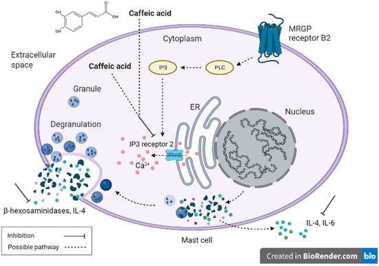 Mast cells, when they are stimulated and activated, release the contents of the granules, including histamine, serotonin, proteoglycans, and proteases, which is called degranulation, and then synthesize and secrete lipid mediators, cytokines, and chemokines []. Many cationic substances have been found to initiate IgE-independent pathways, including compound 48/80 (C48/80), substance P (SP), and vasoactive intestinal peptide. Particularly, MRGP receptor X2, a receptor expressed in human mast cells for degranulation signaling, recently attracted much attention and is related to chronic diseases such as urticaria, atopic dermatitis, asthma, and rheumatoid arthritis [,]. Mas-related G protein-coupled receptor, member B2 (MRGP receptor B2) in mice and MRGP receptor B3 in rats, are orthologous genes of MRGP receptor X2 [,]. Regardless of the IgE-dependent or IgE-independent pathway, the flow of calcium ions (Ca2+) is a vital response mechanism for the mast cell activation and degranulation, which may further involve many protein expression and phosphorylation reactions, including tyrosine-protein kinase Lyn, phospholipase Cγ (PLCγ), inositol-1,4,5-trisphosphate receptor (IP3 receptor), etc. [,,]. Natural phytochemicals, such as caffeic acid phenethyl ester (CAPE), which is a caffeic acid (CA) derivative, have been reported to alleviate allergic inflammation through interfering with mast cell activation and degranulation signaling [,,].