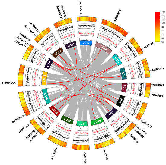 Through homological comparison and identification of conserved structural domains, 19 NINV genes, 4 CWINV genes, and 2 VINV genes were obtained in the kiwifruit genome, namely, AcNINV1~AcNINV19, AcCWINV1~AcCWINV4, and AcVINV1 and AcVINV2, respectively (Table S2). Chromosomal localization analysis indicated that 25 INV genes were distributed across 16 chromosomes (Figure 1). The physicochemical properties of these INV genes showed that the length of their coding sequences (CDSs) varied from 384 to 779 aa, molecular masses (MS) ranged from 42,189.10 to 88,200.76 Da, and the theoretical isoelectric point (pI) varied from 4.75 to 9.1 (Table S2). Furthermore, predictions of protein subcellular localization showed that the AcINV family is predominantly distributed in chloroplasts and cytoplasm (Table S2).