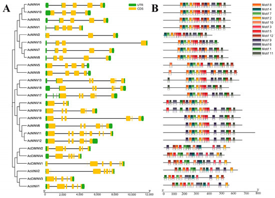 Analysis of the structure and conserved motifs of the kiwifruit INV family genes. (A) Analysis of the structure of the INV family of genes in kiwifruit. (B) Conserved motif analysis of kiwifruit INV family genes.