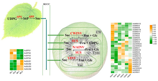 Sketch of kiwifruit sugar metabolism pathways and heat map of sugar metabolism gene expression profiles at fruit developmental stages.