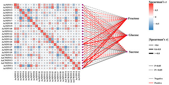 Correlation analysis between the expression level of the INV gene in kiwifruit and soluble sugar content. Solid line represents p < 0.05, dashed line represents p ≥ 0.05, gray line represents negative correlation, and red line represents positive correlation.