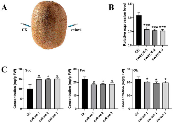 AcCWINV4 gene silencing to analyze the soluble sugar content of kiwifruit fruit. (A) AcCWINV4-gene-silenced fruit phenotypes. (B) Levels of AcCWINV4 in fruits where the AcCWINV4 genes were silenced. (C) AcCWINV4 gene silencing of glucose, fructose, and sucrose content in fruits. * Represents p < 0.05, and *** represents p < 0.001.