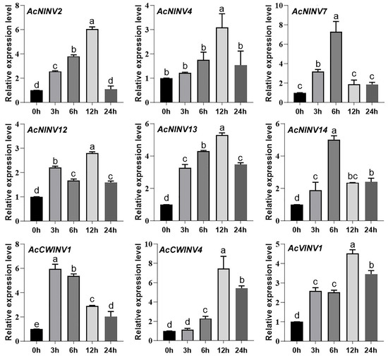 The expression patterns of AcINV genes under cold treatment. a, b, c, d, etc., denote the significance of differences between groups. Identical letters indicate no significant difference between groups (p > 0.05), while different letters indicate significant differences between groups (p < 0.05).