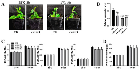 Cold resistance analysis of leaves of kiwifruit with AcCWINV4 gene silence. (A) Phenotypes of CK and cwinv4 at 25 °C and 4 °C for 8 h, respectively. (B) Expression level of AcCWINV4 after silencing of AcCWINV4 gene. (C) The activities of SOD, POD, and CAT in CK and cwinv4 were analyzed after 8 h at 25 °C and 4 °C, respectively. (D) The proline content of CK and cwinv4 was determined after being left at 25 °C and 4 °C for 8 h, respectively. * Represents p < 0.05, and *** represents p < 0.001.