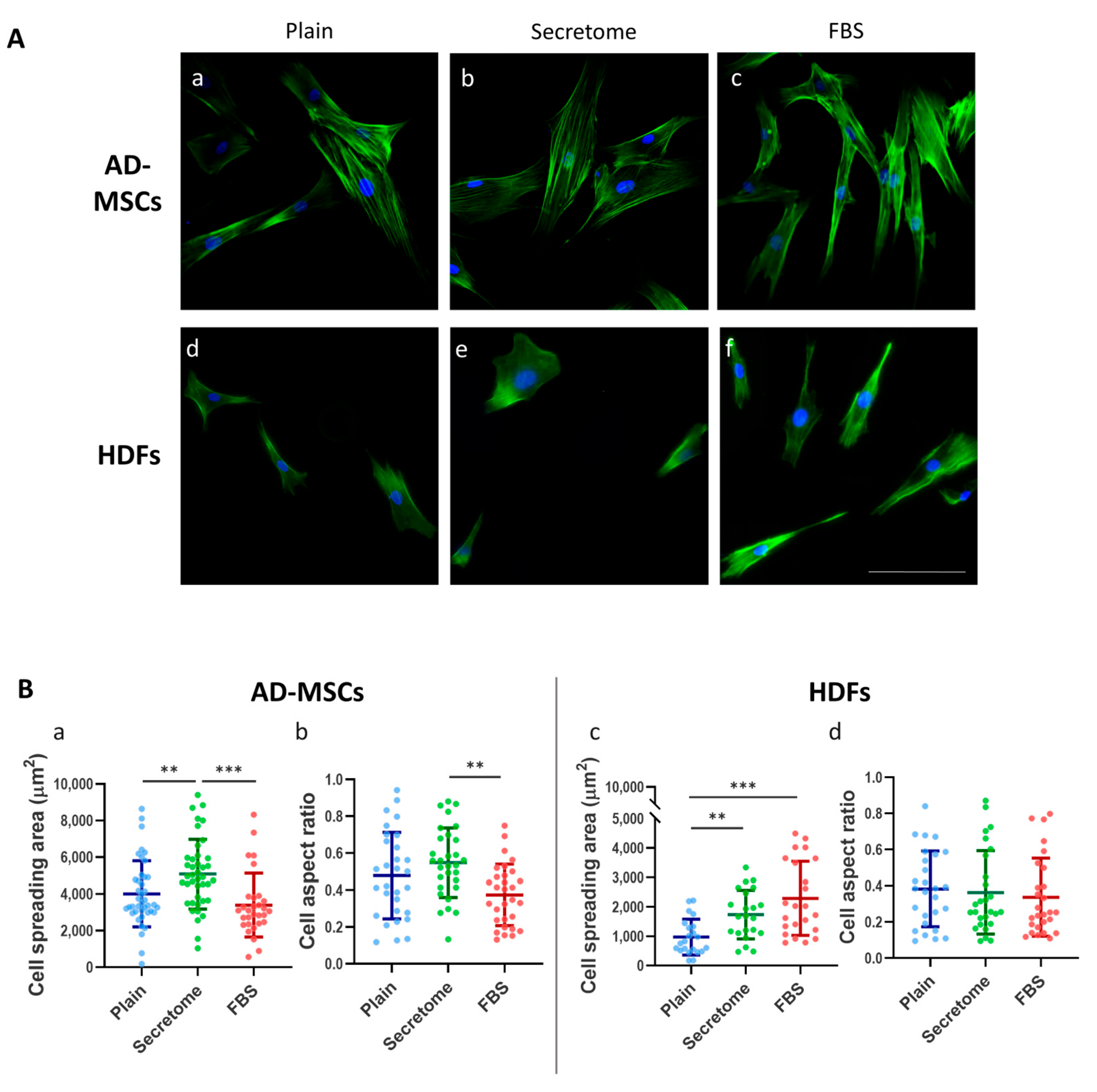 2.1. Effect of the WJ-MSCs’ Secretome on the Morphology of AD-MSCs and Fibroblasts