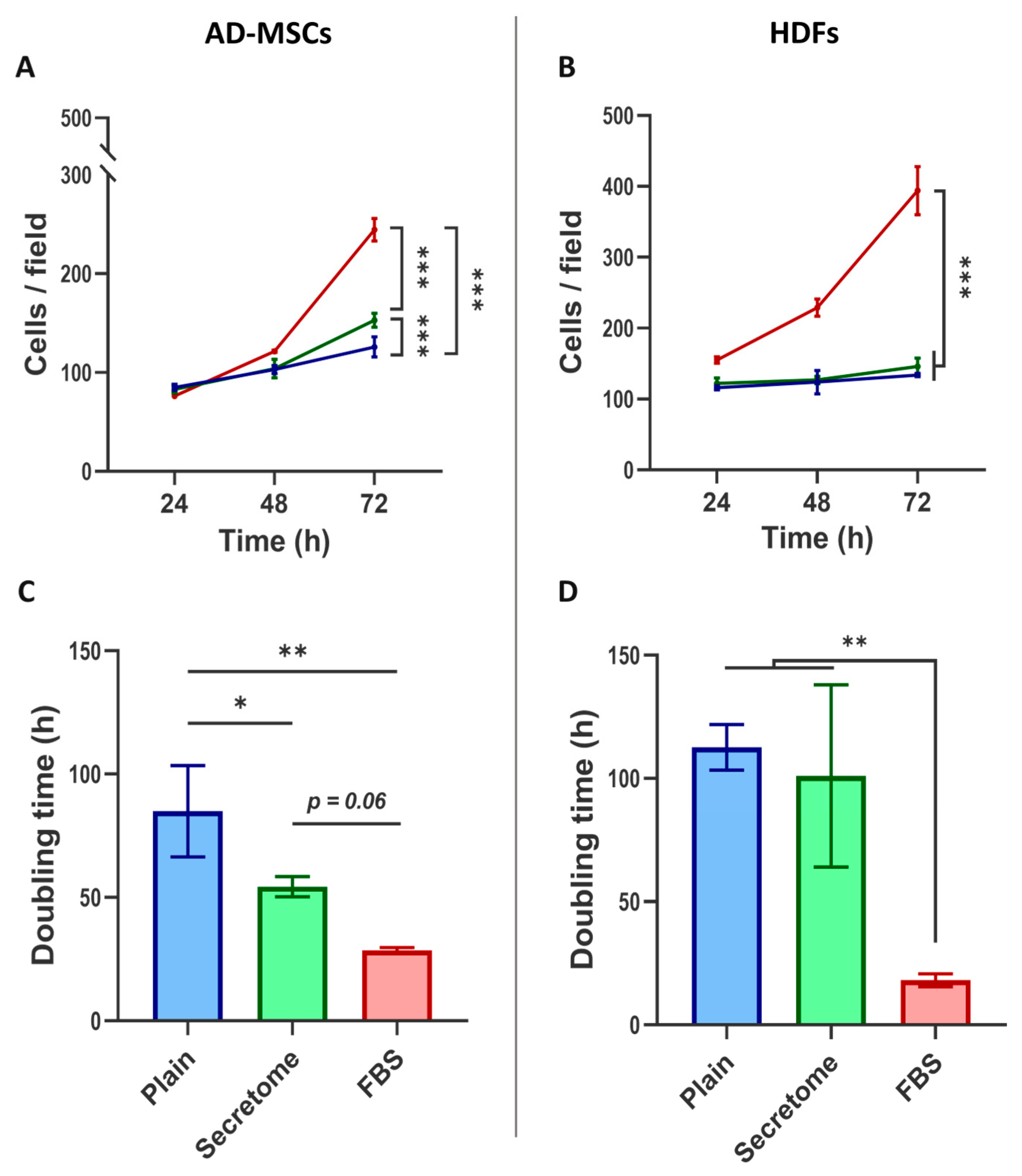 2.2. WJ-MSC Secretome Supports the Growth of MSCs but Not of Fibroblasts