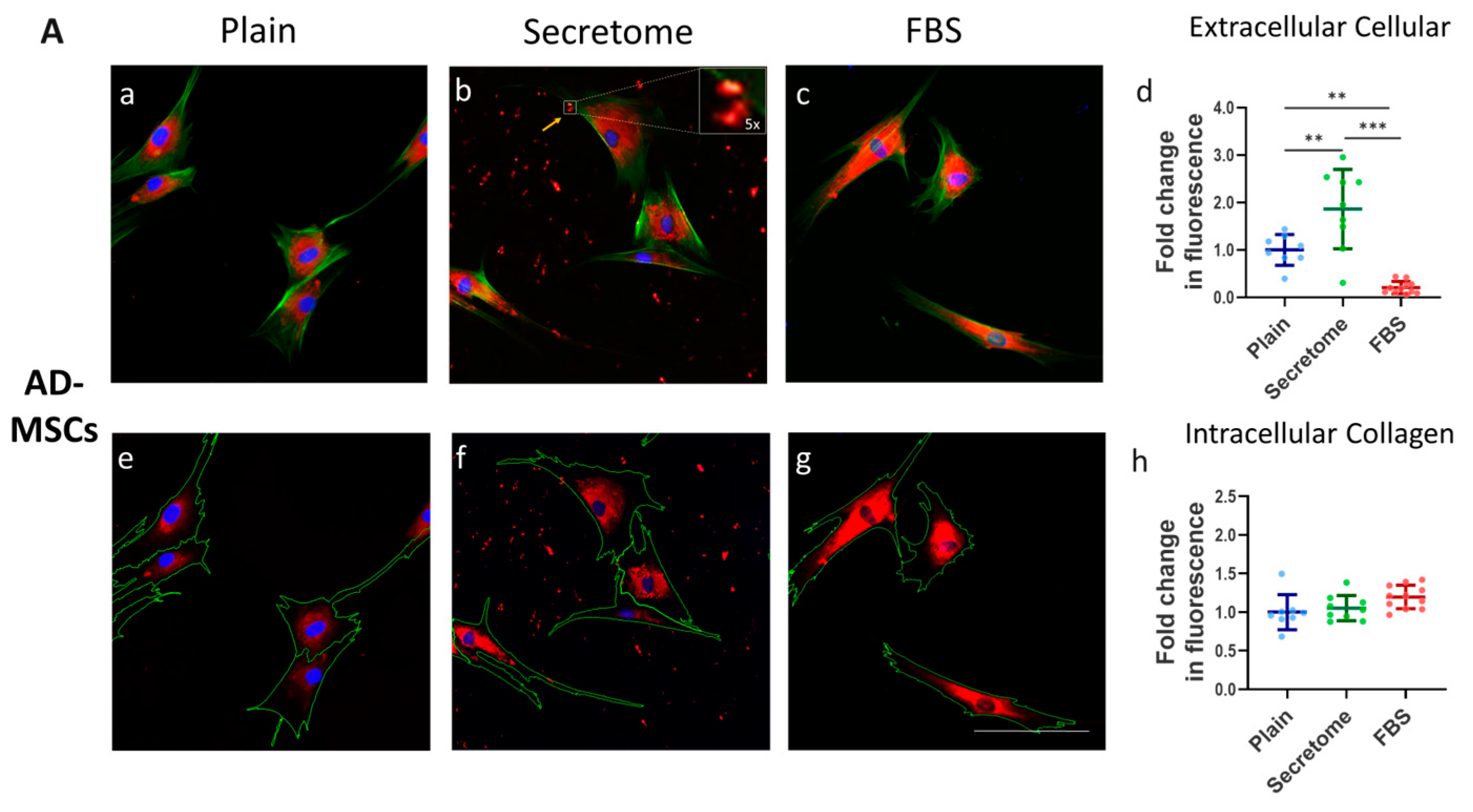 2.4. Paracrine Signaling from WJ-MSCs Modulates Extracellular Collagen Deposition