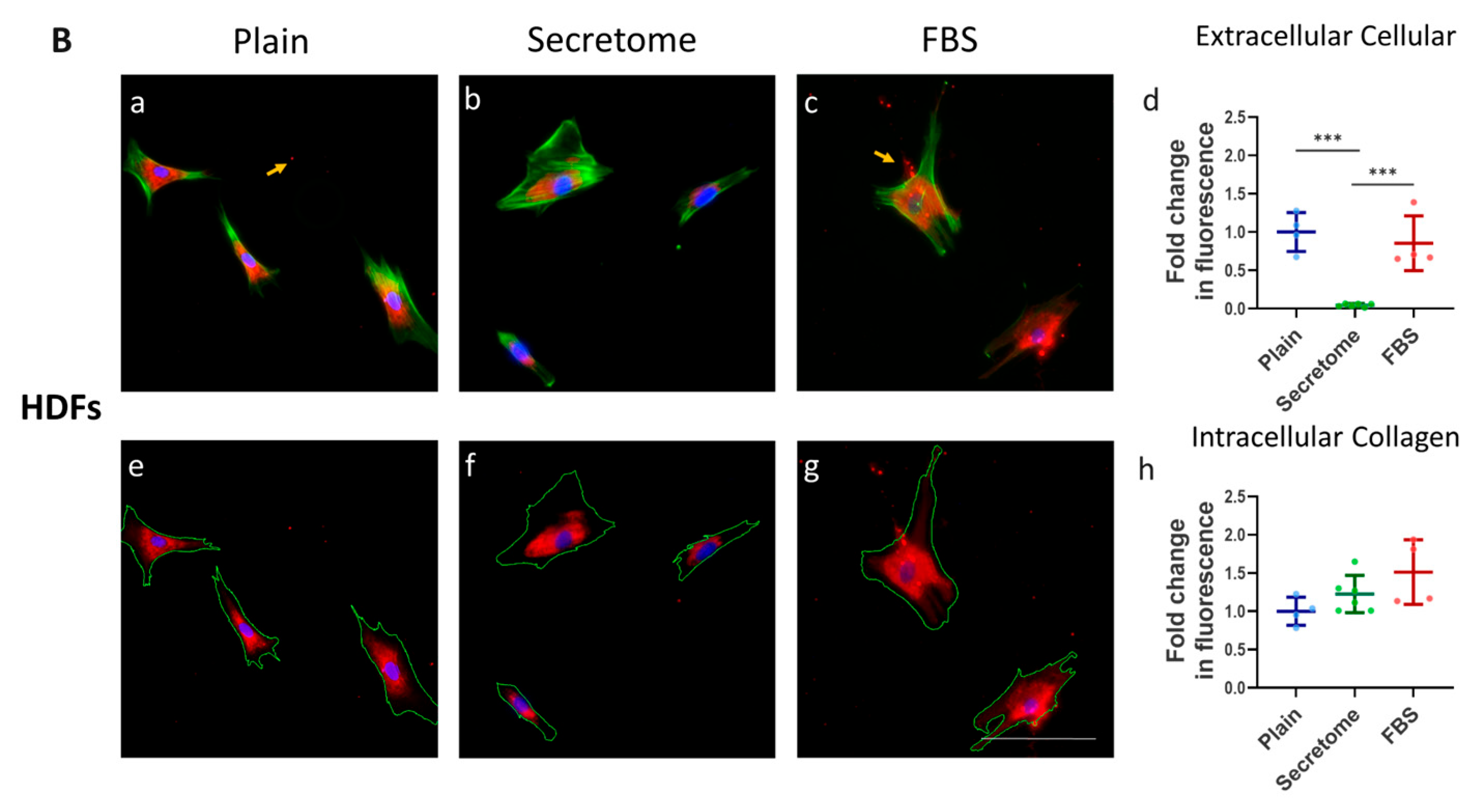 - Time-limited assessment: Our analysis focused on cellular responses within a 72 h window, capturing early proliferative, migratory, and ECM remodeling events. However, MSC secretome effects may evolve over longer durations, influencing differentiation, immunomodulation, and tissue integration. Time-course studies extending beyond 72 h are needed to assess sustained activation, potential senescence, or feedback inhibition mechanisms.