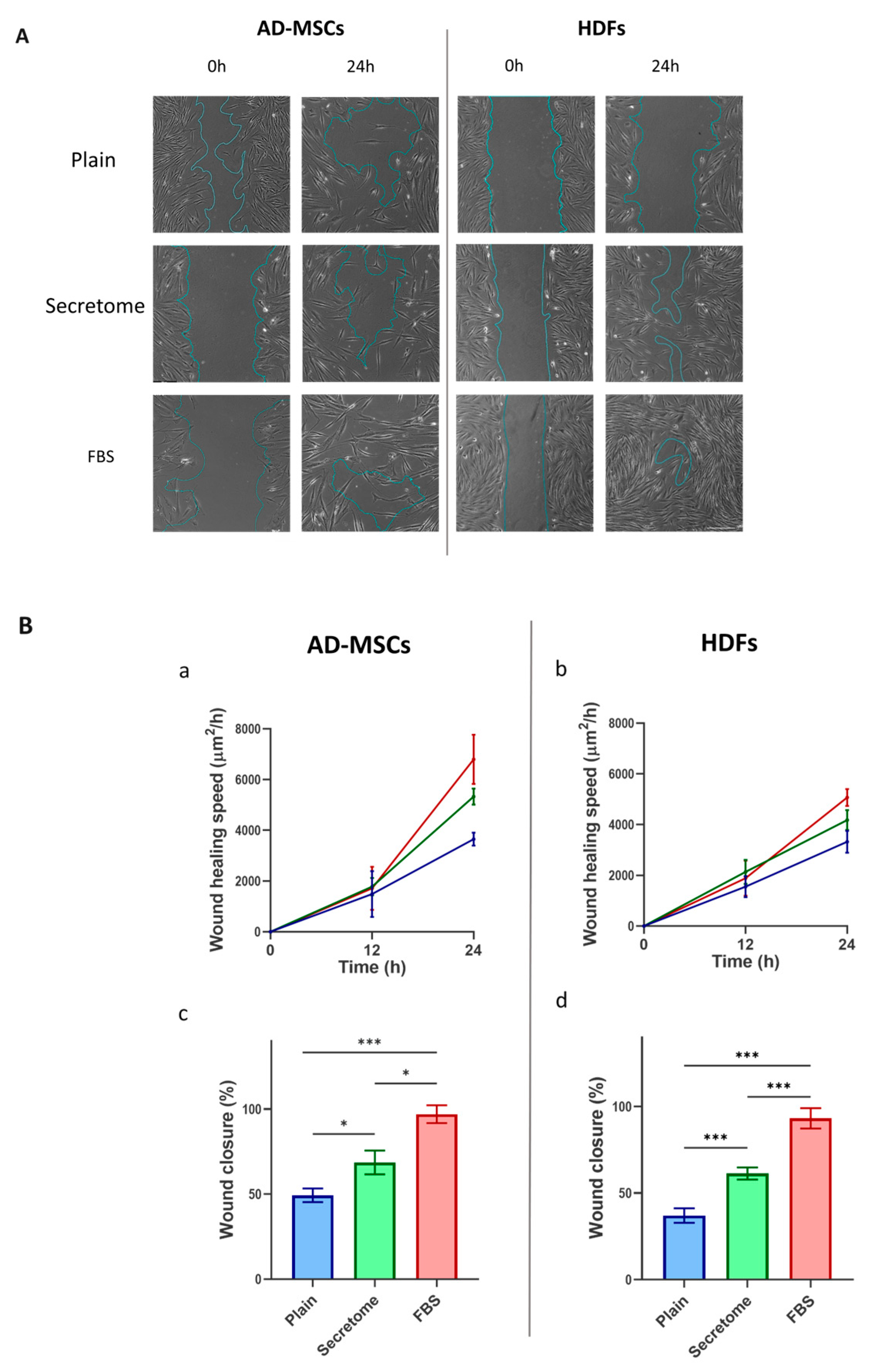 2.5. WJ-MSC Secretome Enhances Migration of Both Stem Cells and Fibroblasts