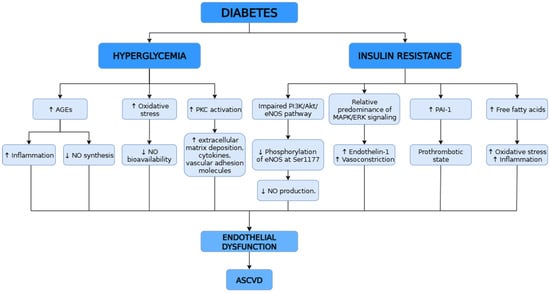 DM, especially T2DM, significantly increases cardiovascular risk, largely through endothelial dysfunction. Chronic hyperglycemia reduces NO availability, increases oxidative stress, and promotes inflammation via AGEs and protein kinase C activation. Insulin resistance further impairs endothelial function by disrupting PI3K/Akt/eNOS signaling, enhancing proinflammatory pathways, and increasing oxidative stress through elevated free fatty acids. These mechanisms together drive the development and progression of ASCVD in DM.