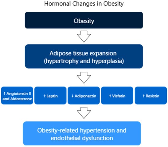 Hypertension remains a leading cause of cardiovascular complications and increased mortality. Recent research highlights the crucial role of endothelial dysfunction in the onset of arterial hypertension. Endothelial dysfunction is considered a characteristic feature of the vascular system in individuals with hypertension. Additionally, studies have shown that endothelial dysfunction contributes to the development of both atherosclerosis and arteriosclerosis. A key factor in this process is the reduced bioavailability of NO, which is essential for proper vascular function. Other contributing elements include oxidative stress and vascular inflammation, which influence vascular resistance through two main mechanisms: (1) impaired vasoconstriction and vasodilation, and (2) stimulation of vascular smooth muscle cell proliferation and the initiation of arteriosclerotic processes. The activation of pro-by-inflammatory, pro-fibrotic, redox-sensitive, and growth/apoptosis-related pathways leads to structural, functional, and mechanical alterations in blood vessels, resulting in remodeling, calcification, and further endothelial dysfunction []. In hypertension, the persistent elevation of pressure in small blood vessels causes premature aging and increased turnover of ECs. These damaged cells are replaced by newly regenerated ones, but the new endothelium has a reduced ability to produce endothelium-derived relaxing factors (EDRFs), especially NO. As a result, there is a shift in balance toward endothelium-derived contracting factors (EDCFs), such as angiotensin II, endothelins, uridine adenosine tetraphosphate, and cyclooxygenase-derived substances, leading to increased vasoconstriction [,]. For example, endothelin-1 is the main isoform produced by ECs, is a strong vasoconstrictor that raises blood pressure by promoting smooth muscle contraction and sodium retention. It acts through ETA and ETB receptors on vascular smooth muscle, triggering calcium release via IP3. ETB receptors on ECs, however, stimulate NO release and promote natriuresis, temporarily lowering blood pressure. Systemic administration of endothelin-1 first causes brief vasodilation (via endothelial ETB), followed by prolonged vasoconstriction (via ETA and ETB on smooth muscle). Endothelin-1 also promotes the release of cyclooxygenase-derived EDCFs, like thromboxane A2, further enhancing vasoconstriction. This contributes to the imbalance in hypertension, where vasoconstrictors dominate due to impaired endothelial function []. Obesity contributes significantly to endothelial dysfunction and the development of hypertension by disrupting the normal function of PVAT. In healthy individuals, PVAT supports blood vessel relaxation by releasing vasodilatory adipokines. However, in obesity, this balance is disturbed—the secretion of relaxing factors decreases, while proinflammatory and vasoconstrictive substances like TNF-α and ET-1 increase. This shift leads to a reduced availability of NO and an imbalance between NO and ET-1 signaling, favoring vasoconstriction. Additionally, obesity is associated with increased oxidative stress, mainly due to activation of NADPH oxidase (NOX2), which leads to eNOS uncoupling. This process lowers NO production and increases superoxide generation, further impairing vascular relaxation. Interestingly, although overall ROS production may be lower in obese animals, their blood vessels are more sensitive to ROS, which intensifies the effects of ET-1. These mechanisms—combined with those described earlier, such as impaired NO release and increased EDCFs—contribute to the progression of endothelial dysfunction and obesity-related hypertension []. In obesity, adipose tissue releases hormones and factors that disrupt vascular function and raise blood pressure (Figure 4). Adipocytes produce angiotensin II and aldosterone, promoting vasoconstriction via vascular smooth muscle activation. Obesity leads to adipose tissue expansion through hypertrophy and hyperplasia, accompanied by increased levels of leptin. Elevated leptin stimulates sympathetic nervous system activity, raising heart rate and blood pressure. Blocking leptin or its receptors in the hypothalamus normalizes blood pressure in obese rodents. Interestingly, leptin-deficient animals and humans have lower blood pressure despite severe obesity, though the link between chronic high leptin levels, leptin resistance, and hypertension remains unclear. Adiponectin, another adipokine, is typically reduced in obesity—especially in individuals with visceral fat accumulation—and lower levels are associated with hypertension. Weight loss and antihypertensive treatments can increase adiponectin levels and improve blood pressure. Other adipokines like visfatin and resistin are also increased. Visfatin rises with hypoxia and is seen in hypertension, while resistin is associated with insulin resistance and hypertension in diabetics. These changes contribute to the development of obesity-related hypertension []. Hypertension is closely linked to endothelial dysfunction, marked by reduced NO and increased vasoconstrictors like angiotensin II and endothelin-1. This imbalance leads to vessel constriction, inflammation, and vascular remodeling. Obesity worsens this process by disrupting perivascular fat function, increasing inflammation and oxidative stress, and lowering NO availability. Elevated leptin and reduced adiponectin further raise blood pressure, contributing to obesity-related hypertension.
